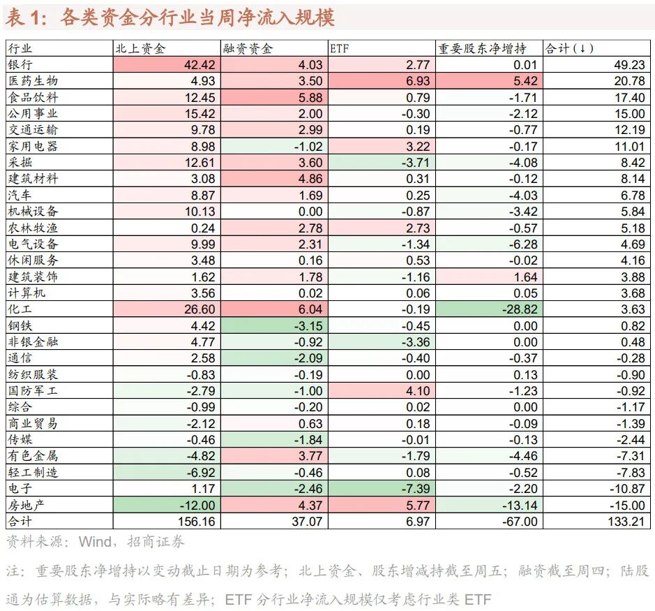 【资金·众寡】北上资金大幅回流,两融继续流入。北上资金本周净流入152.2亿元;融资资金前四个交易日合计净流入30.2亿元;新成立偏股类公募基金23.3亿份,较前期上升9.9亿份;ETF净赎回,对应净流出44.2亿元。行业偏好上,北上资金净买入规模较高的为银行、化工、公用事业等;融资资金净买入化工、食品饮料、建筑材料等;医药ETF申购较多,信息技术ETF赎回较多。重要股东净减持规模扩大,计划减持规模下降。