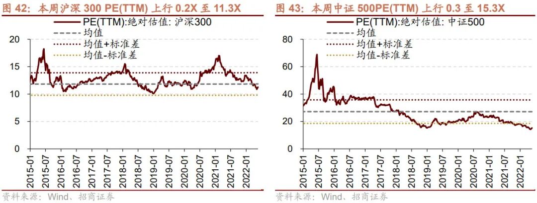 本周全部A股估值水平上行。截至5月20日收盘,全部A股PE(TTM)上行0.3X至13.8X,处于历史估值水平的30.3%分位数。创业板本周上行,PE(TTM)上行0.9X至37.0X,处于历史估值水平的15.0%分位数。代表大盘股的沪深300指数PE(TTM)本周上行0.2X至11.3X,处于历史估值水平的35.0%分位数。代表中小盘股的中证500指数PE(TTM)本周上行0.3至15.3X,处于历史估值水平的0.9%分位数。