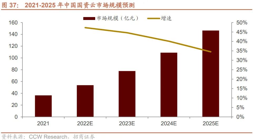 未来四年国资云有望快速发展,至2025年达到近150亿元市场规模。计世资讯发布了《2021-2022年中国国资云市场发展状况研究报告》,报告认为,云服务模式的转变叠加国企数字化转型,带来采购与集成主导权发生变化,国资云市场规模快速发展,2021年达36.5亿元。未来4年中国国资云市场将保持快速增长的势头,年均复合增长率将达到41.53%,预计到2025年中国国资云市场规模约146.48亿元。