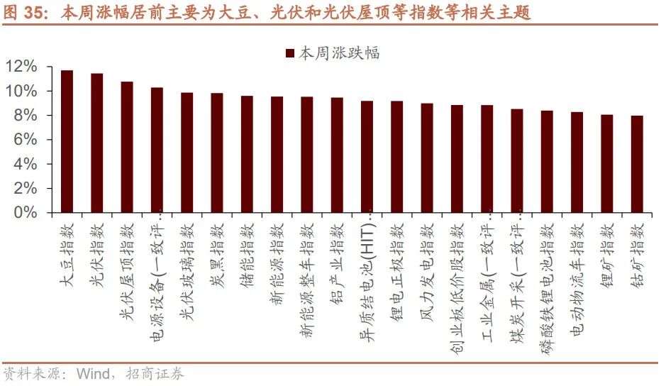 本周市场上涨,Wind全A指数周度上涨2.63%,创业板指上涨2.51%,沪深300上涨2.23%。本周涨幅居前的主要大豆、光伏和电源设备等相关主题。