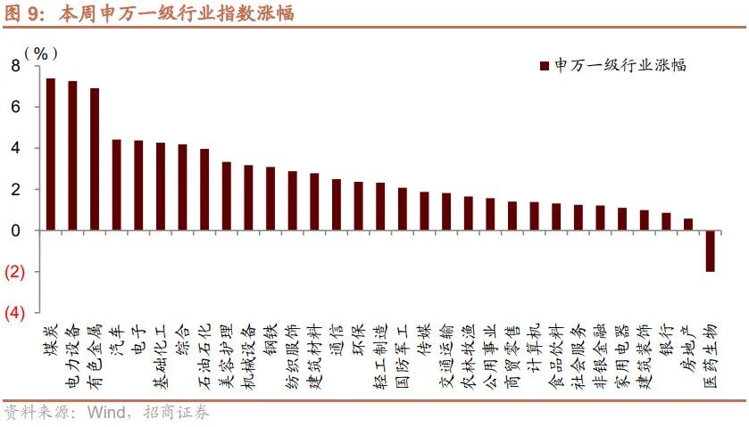 从行业上来看,本周申万一级行业多数上涨,仅1个一级行业下跌,煤炭、电力设备、有色涨幅居前,医药生物行业下跌,房地产、银行涨幅落后。从涨跌原因来看,本周涨幅居前的行业原因主要为,煤炭近期发改委价格司组织重点煤炭和电力企业等召开专题会议,限价范围较市场预期有所收窄,在电价上调、政策管控下煤炭可能长期维持高盈利)、电力设备(新能源板块原材料筑顶预期、电力设备稳增长、复工复产)、有色(稳增长和新开工受益)。本周跌幅居前的行业原因主要为,医药(疫情边际好转,疫情品种轮动下跌)。