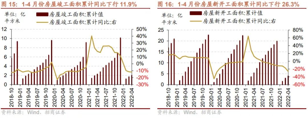 1-4月份房屋竣工面积、商品房销售额、商品房销售面积、房屋新开工面积、开发资金来源累计值同比降幅均扩大,房地产开发投资完成额累计同比转负。1-4月份房屋竣工面积累计值为2.00亿平方米,累计同比下行11.90%,较前值降幅扩大0.4个百分点;1-4月份房屋新开工面积累计值为3.97亿平方米,累计同比下行26.3%,较1-3月份降幅扩大8.8个百分点。