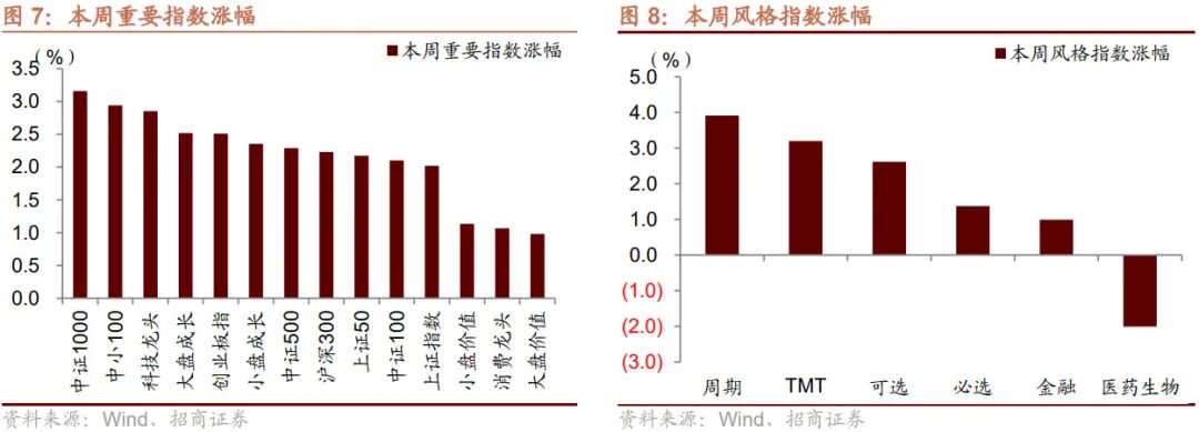 本周A股主要指数全部上涨,跟踪的主要指数中小盘以及成长指数相对较强,中证1000、中小100、科技龙头指数涨幅居前,大盘价值、消费龙头、小盘价值指数涨幅落后,从成交上来看,本周日均成交8150.2亿元,日均成交与前一周相比大体持平。南向资金本周净流入港股126.0亿港币,北向资金本周净流入A股152.2亿人民币。