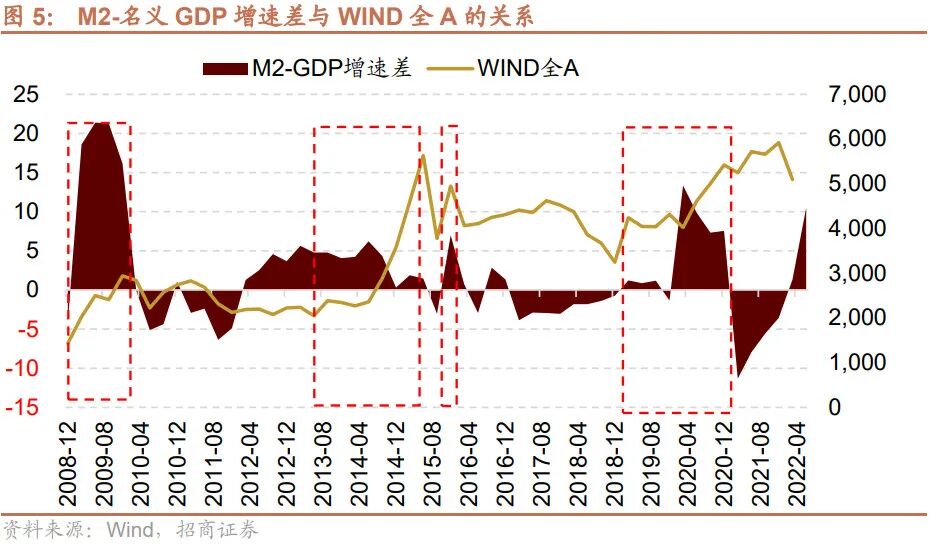 同样的道理,M2增速高于名义GDP增速,WIND全A也有可能会出现较为明显的上行,体现为流动性宽松的“溢出效应”。