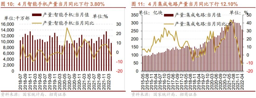 【中观·景气】4月份智能手机产量当月同比转负,集成电路产量同比降幅扩大,工业机器人产量当月同比由正转负;1-4月份房屋竣工面积、商品房销售额、商品房销售面积、房屋新开工面积、开发资金来源累计值同比降幅均扩大,房地产开发投资完成额累计同比转负。1-4月我国发电量累计同比增幅收窄,4月我国用电量累计同比转负。本周钢坯、螺纹钢价格继续下行,铁矿石价格指数上行。全国及多地区水泥价格指数均下行。