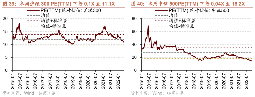 本周全部A股估值水平下行。截至5月27日收盘,全部A股PE(TTM)下行0.1X至13.7X,处于历史估值水平的30.1%分位数。创业板本周下行,PE(TTM)下行1.2X至35.9X,处于历史估值水平的13.1%分位数。代表大盘股的沪深300指数PE(TTM)本周下行0.1X至11.1X,处于历史估值水平的33.0%分位数。代表中小盘股的中证500指数PE(TTM)本周下行0.04X至15.2X,处于历史估值水平的0.7%分位数。