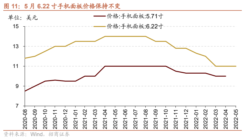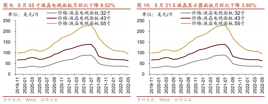5月液晶电视面板月环比下降。液晶电视面板方面,5月32寸液晶电视面板价格为34.0美元/片,较上月下跌10.53%;43寸液晶电视面板价格较上月跌5.97%至63.0美元/片;55寸液晶电视面板价格较上月跌9.52%至95.0美元/片;液晶显示器面板价格月环比下降,截至5月23日,21.5寸液晶显示器面板价格为49.3美元,月环比下降3.90%;7寸平板电脑面板价格为13.5美元,较上月下降6.90%;23.8寸液晶显示器面板价格月环比下降7.23%至64.2美元/片;5月手机面板价格保持不变,5月6.22寸手机面板价格维持在11.0美元/片;5.71寸手机面板价格为10.0美元/片,与上月持平。