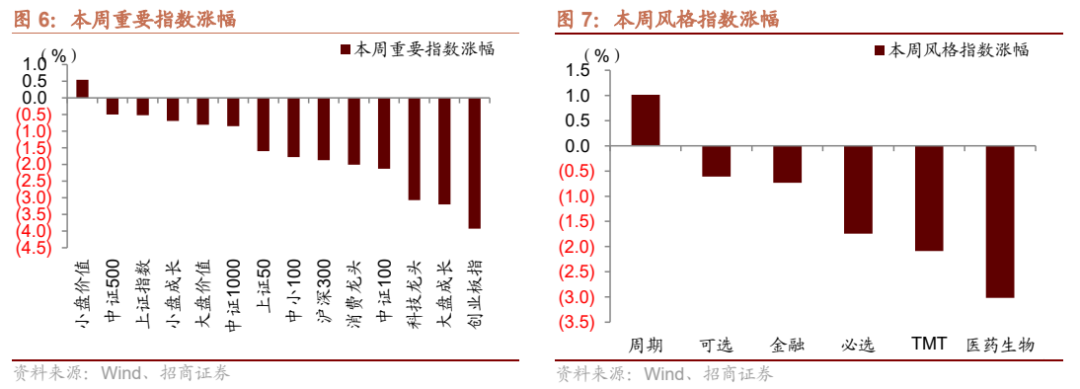 本周A股主要指数多数下跌,跟踪的主要指数中小盘指数相对较强,小盘价值、中证500、上证指数、小盘成长指数涨幅居前,创业板指、大盘成长、科技龙头指数跌幅居前,从成交上来看,本周日均成交8502.5亿元,日均成交与前一周相比有所放量。南向资金本周净流入港股85.9亿港币,北向资金本周净流出A股95.8亿人民币。