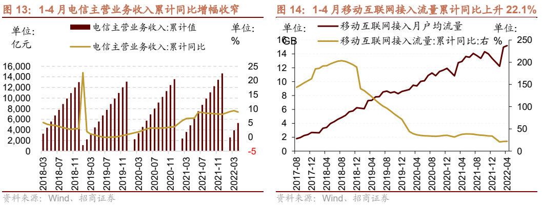 1-4月电信主营业务收入累计同比增幅收窄。1-4月电信主营业务累计收入为5292亿元,累计同比上升8.8%,增幅较1-3月收窄0.5个百分点。