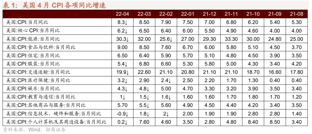 本周发布的美联储5月份议息会议纪要显示,虽然美联储继续重申控制通胀的决心,但对通胀预期则有逐步筑顶的迹象,纪要继续维持2022年PCE增长4.3%的预测结果不变,但对2023和2024年通胀的预测分别下调0.4个百分点和0.2个百分点。从此前发布的美国4月CPI数据来看,增速有所回落,但食品饮料价格依然处在加速的过程中,能源项依然处于增速高位。虽然相比于美联储2%的中期目标还很遥远,但对于市场而言,通胀预期筑顶更为重要,即使本轮通胀筑顶过程有可能是漫长的。