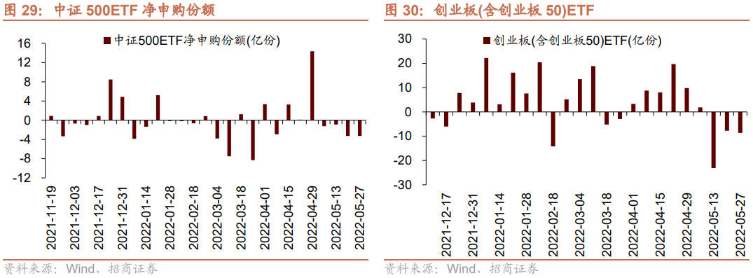 5月23日-5月27日,ETF净申购,当周净申购39.33亿份,宽指ETF申赎参半,其中沪深300ETF申购较多,创业板(含创业板50)ETF赎回较多;行业ETF均为净申购,其中医药ETF申购最多。具体的,沪深300ETF净申购1.3亿份;创业板ETF净赎回6.3亿份;中证500ETF净赎回3.1亿份;上证50ETF净申购0.1亿份。双创50ETF净申购1.2亿份。行业方面,信息技术ETF净申购2.2亿份;消费ETF净申购16.2亿份;医药ETF净申购23.1亿份;券商ETF净申购1.8亿份;金融地产ETF净申购11.5亿份;军工ETF净申购2.4亿份;原材料ETF净申购0.4亿份;新能源&智能汽车ETF净申购0.5亿份。