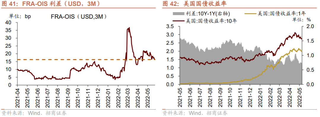 5月23日-5月27日,短、长端美债收益率下行,利差扩大,FRA-OIS利差缩小。美国1年期国债收益率下行6.0bp至2.01%,10年期国债收益率下行4.0bp至2.74%,利差扩大2.0bp至0.73%,截止5月29日,FRA-OIS利差为16.3bp,较前期(5月22日)下降2.1bp,处于2010年以来的39.98%分位。