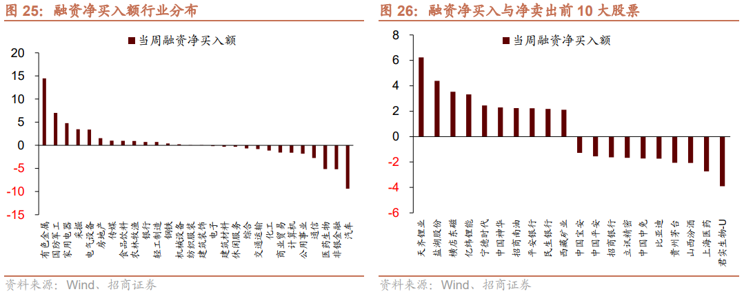 5月23日-5月27日,融资资金净流入0.9亿元。具体来看,本周融资资金买入有色金属(+14.5亿元)、国防军工(+7.0亿元)、家用电器(+4.8亿元)等行业,净卖出汽车(-9.4亿元)、非银金融(-5.2亿元)、医药生物(-5.1亿元)等行业。个股方面,融资净买入规模较高的为天齐锂业(+6.2亿元)、盐湖股份(+4.4亿元)、横店东磁(+3.5亿元)等;融资净卖出规模较高的包括君实生物-U(-3.9亿元)、上海医药(-2.7亿元)、山西汾酒(-2.1亿元)等。