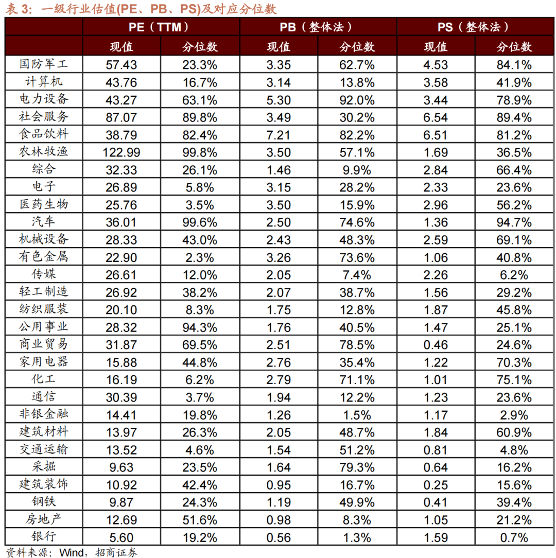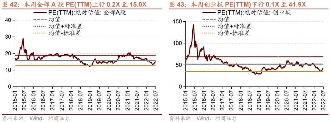 本周全部A股估值水平上行。截至7月1日收盘,全部A股PE(TTM)上行0.2X至15.0X,处于历史估值水平的41.6%分位数。创业板本周下行,PE(TTM)下行0.1X至41.9X,处于历史估值水平的27.0%分位数。代表大盘股的沪深300指数PE(TTM)本周上行0.1X至12.3X,处于历史估值水平的55.1%分位数。代表中小盘股的中证500指数PE(TTM)本周上行0.2X至17.0X,处于历史估值水平的6.8%分位数。