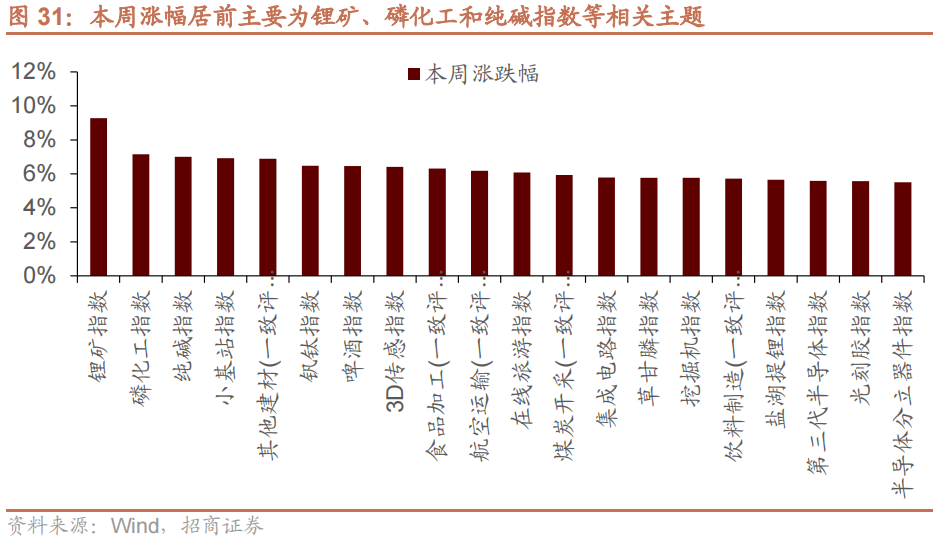本周市场涨跌互现,Wind全A指数周度上涨1.37%,创业板指下跌1.50%,沪深300上涨1.64%。本周涨幅居前的主要锂矿、磷化工和纯碱指数等相关主题。