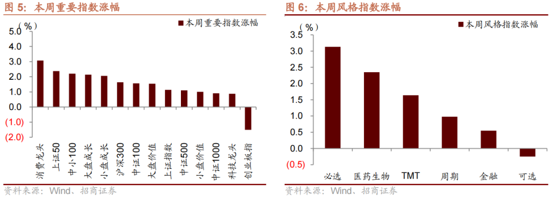 本周A股主要指数多数上涨,跟踪的主要指数中偏中大市值指数相对较强,消费龙头、上证50、中小100指数涨幅居前,创业板指跌幅居前,科技龙头指数、中证1000、小盘价值指数涨幅落后,从成交上来看,本周日均成交11957.5亿元,日均成交与前一周相比有所放量,市场连续四周周度日均成交维持万亿以上,市场情绪较前几周明显更高。南向资金本周净流入港股170.6亿港币,北向资金本周净流入A股102.3亿人民币。