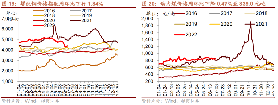 焦煤、焦炭、动力煤期货价格周环比下降。截至7月1日,焦炭期货价格周环比下降0.2%至3041.0元/吨,焦煤期货价格周环比下降1.41%至2307.0元/吨,动力煤期货价格周环比下降0.47%至839.0元/吨。