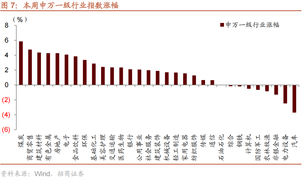 从行业上来看,本周申万一级行业多数上涨,仅9个一级行业下跌,煤炭、商贸零售、建筑材料涨幅居前,汽车、电力设备、非银跌幅居前。从涨跌原因来看,本周涨幅居前的行业原因主要为,煤炭(旺季需求恢复、稳增长对需求的提振、全球需求)、商贸零售(出行政策边际放松、旅游旺季来临)、建材(复苏预期)。本周跌幅居前的行业原因主要为,汽车和电力设备(行业景气和需求无明显向下边际变化,调整主要为前期涨幅较高,板块轮动因素导致)。