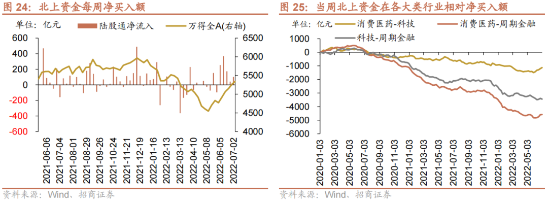本周(6月27日-6月29日)北向资金净流入102.3亿元,净买入额扩大61.7亿元。行业偏好上,北上资金净买入规模较高的为食品饮料、银行、非银金融等,分别净买入34.2亿元、31.0亿元、20.1亿元;集中卖出电子、家用电器、有色金属等,净卖出规模达-18.3亿元、-15.7亿元、-15.4亿元。