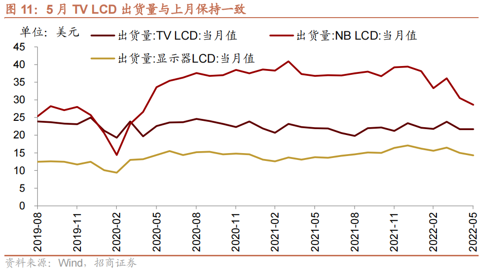 5月显示器出货量环比下行。5月TV LCD出货量为21.7百万个,同比下行1.36%,环比与上月保持持平;NB LCD出货量为28.6百万,同比下行22.28%,环比下行6.23%;显示器LCD出货量为14.3百万个,同比上升3.62%,环比下行4.67%。