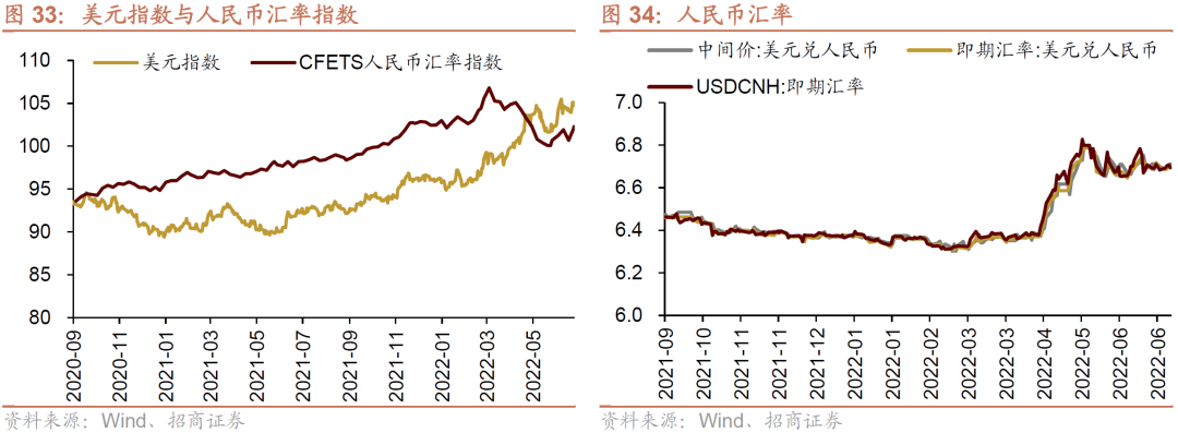 6月27日-7月1日,美元指数回升,人民币相对美元汇率与前期基本持平。截止7月1日,美元指数收于105.12,较前期(6月26日)上升0.99点,人民币汇率指数较前期上升1.6点收于102.3点,美元兑人民币中间价下降、即期汇率上升、离岸汇率上升,分别为6.69、6.70、6.70,人民币相对美元汇率与前期基本持平。