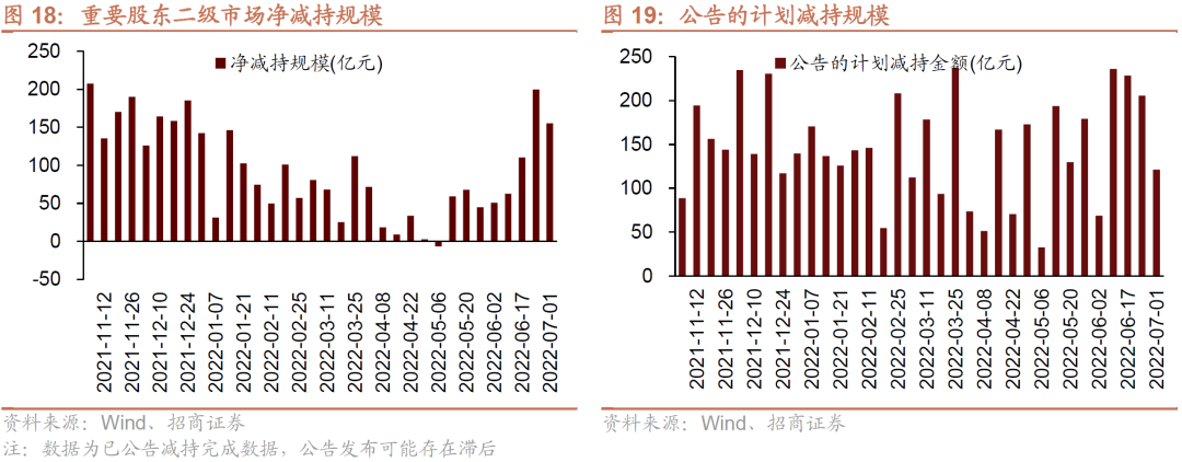 资金需求方面,6月27日-7月1日,IPO融资金额回升至90.8亿元,共有10家公司进行IPO发行,截至7月4日公告,未来一周将有6家公司进行IPO发行,计划募资规模42.4亿元。重要股东净减持规模缩小,净减持155.2亿元;公告的计划减持规模121.2亿元,较前期下降。