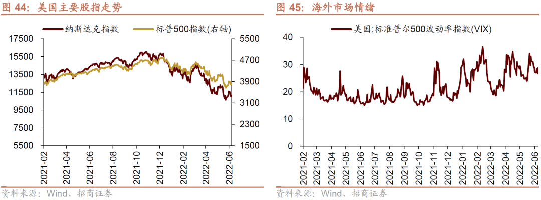 上周VIX指数回落,全周较前期(6月26日)下降0.53点至26.70,市场风险偏好小幅改善。受到美联储激进加息前景和欧美经济下行预期加强的影响,上周标普500指数下跌4.13%,纳斯达克指数下跌2.21%。