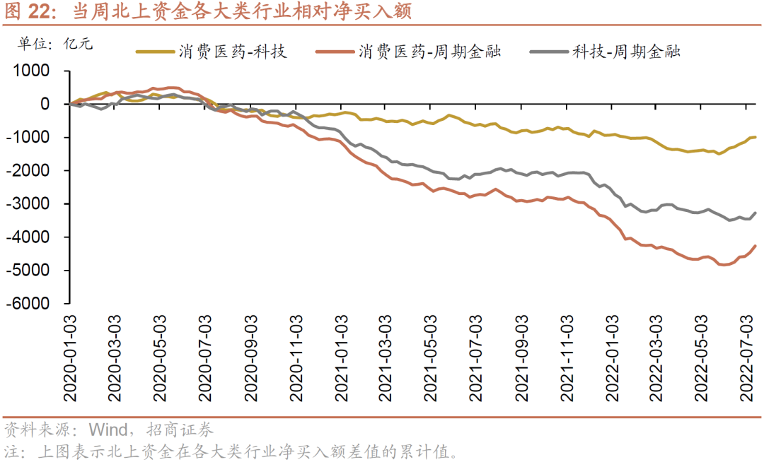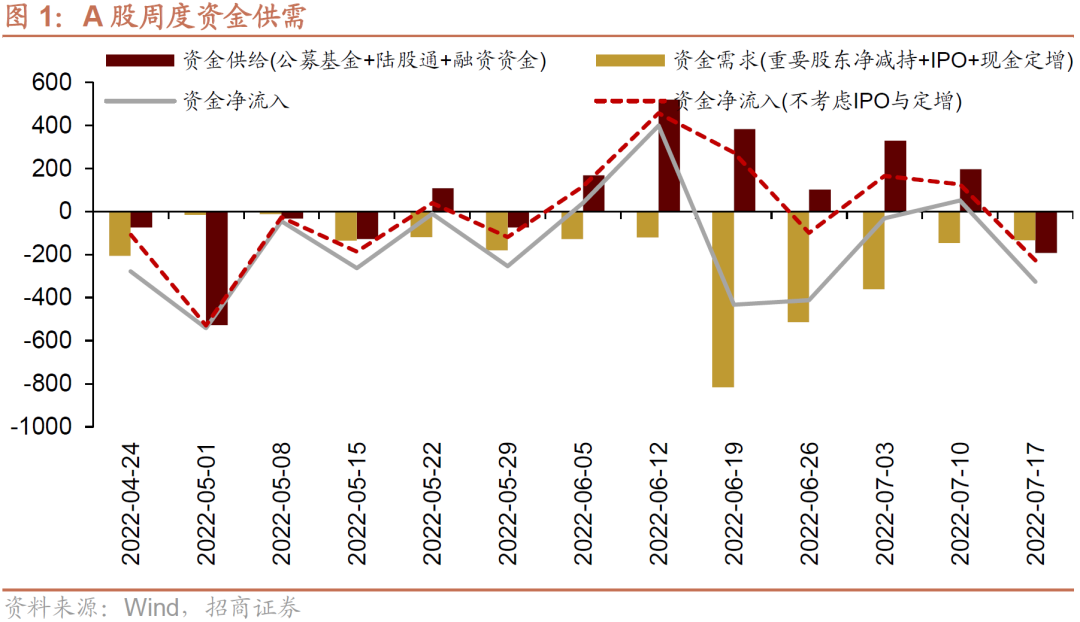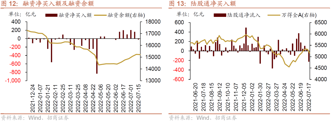 资金供给方面,7月11日-7月15日,新成立偏股类公募基金168.1亿份,较前期增多56.4亿份。股票型ETF较前期净流入,对应净流入47.1亿元。全周整个市场融资净卖出22.1亿元,从前期净流入转为净流出,截止7月15日,A股融资余额为15212.2亿元。陆股通本周净流出,当周净流出规模为220.4亿元,从前期净流入转为净流出。