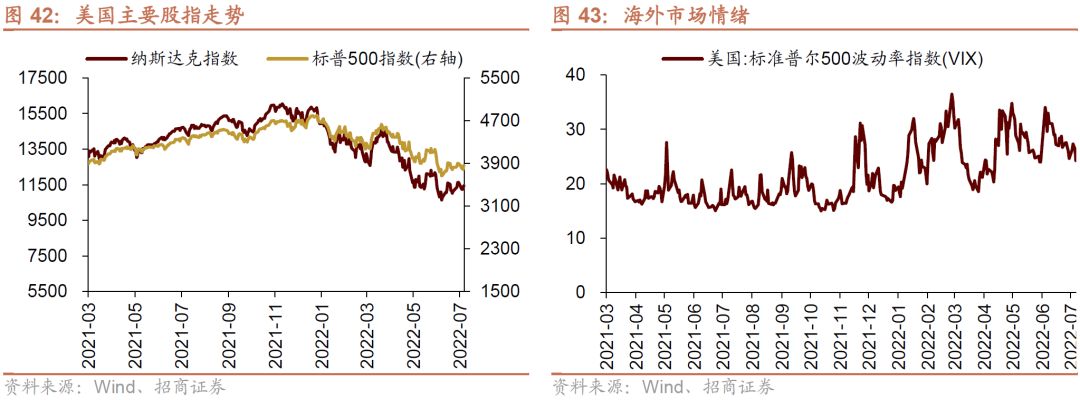 上周VIX指数回落,全周较前期(7月10日)下降0.41点至24.23,市场风险偏好改善。美国通胀持续高企,上周标普500指数下跌1.57%,纳斯达克指数下跌0.93%。