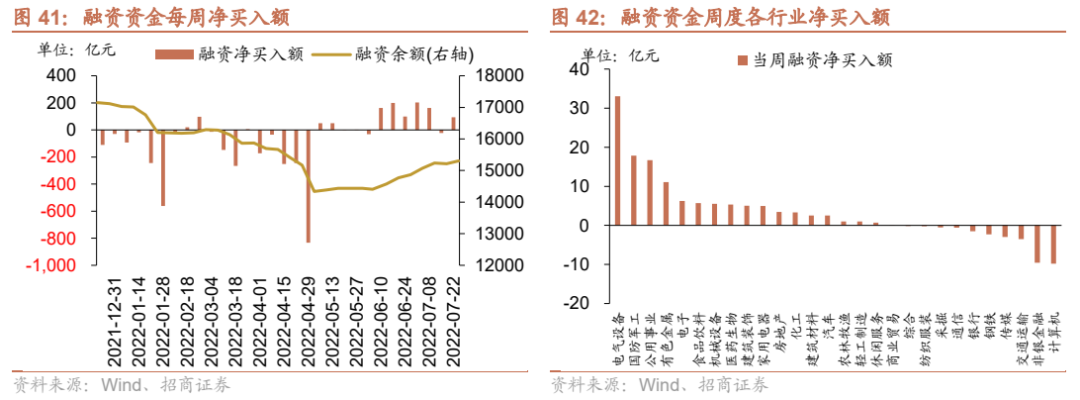 两融方面,融资资金前四个交易日净流入94.0亿元。从行业偏好来看,本周融资资金集中买入电气设备,净买入额达33.0亿元,其他净买入规模最高的行业主要包括国防军工、公用事业、有色金属等;净卖出的主要是计算机、非银金融、交通运输等。从个股来看,融资净买入较高个股包括通威股份、南都电源、容百科技等,净卖出较多的主要包括阳光电源、北方华创、天齐锂业等。
