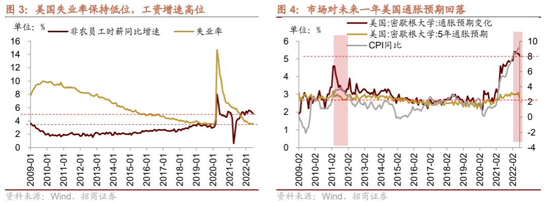 另外,美国的就业市场依然强劲,弱化经济衰退预期,支撑美联储加息。美国失业率保持在3.6%的历史低位,而与此同时美国的非农员工时薪仍保持着5%以上的较高增速,均显示美国的就业市场火热,这一定程度上缓解了市场对于美国经济衰退的担忧。但同时也为美联储为遏制通胀而进行持续加息提供了支撑。