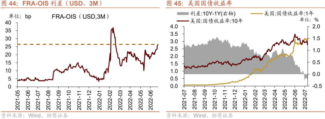 7月18日-7月22日,短、长端美债收益率下行,利差缩小,FRA-OIS利差扩大。美国1年期国债收益率下行11.0bp至3.01%,10年期国债收益率下行16.0bp至2.77%,利差缩小5.0bp至-0.24%,截止7月24日,FRA-OIS利差为26.45bp,较前期(7月17日)上升3.65bp,处于2010年以来的71.78%分位。