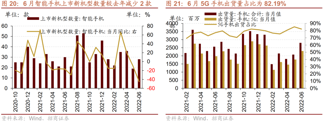 6月5G手机出货量占比下降。6月手机出货量当月值为2801.7万部,较上月上升34.66%,其中5G手机出货量为2302.7万部,占比82.19%,出货占比较上月下降了3.07个百分点。