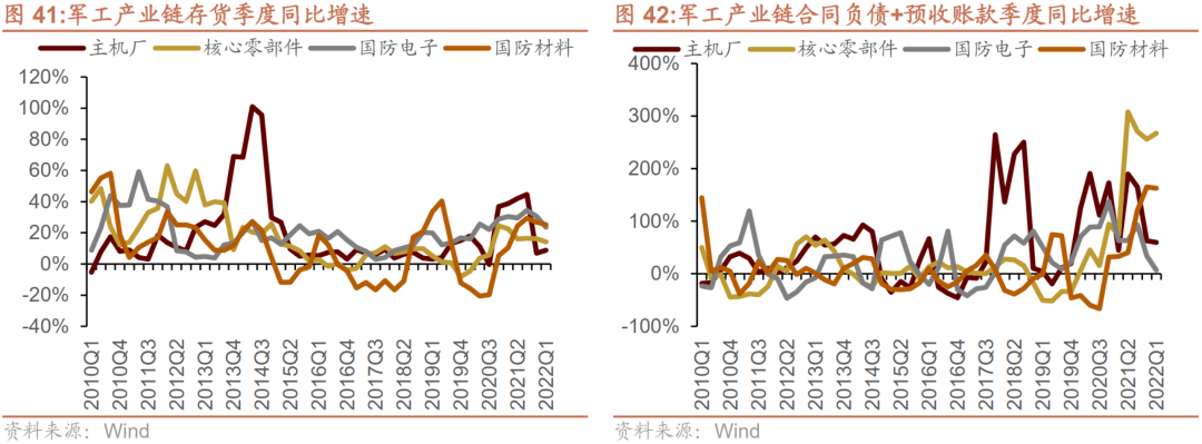 (1) 存货:产业链上游存货相比去年大幅提升。从历史数据来看,核心零部件厂商的存货增长相比主机厂领先0.5~1年,进入2021年,核心零部件厂商的存货增速维持在20%左右,推测未来一年左右主机厂的存货也将走高。2022Q1,国防材料、国防电子厂商存货季度增速约25%,核心零部件存货季度增速约15%,上游厂商与零部件厂商积极备货,说明需求旺盛,企业有信心压货。