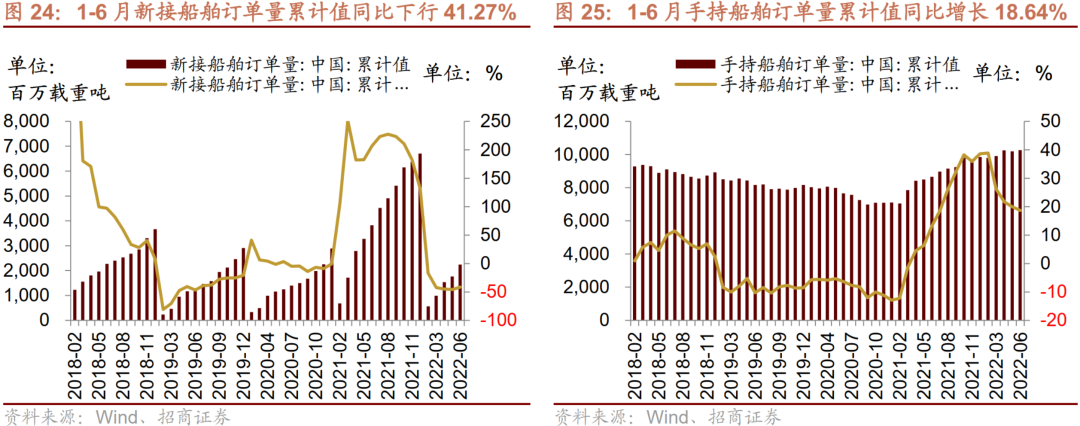 1-6新接船舶订单量累计同比降幅收窄,手持船舶订单量累计值同比增幅缩窄。1-6新接船舶订单量累计值为2246.0万载重吨,累计同比下行41.27%,增幅较上月收窄4.69个百分点。1-6月手持船舶订单量累计值为10274.0万载重吨,累计同比上升18.64%,较上月增幅缩窄1.35个百分点。