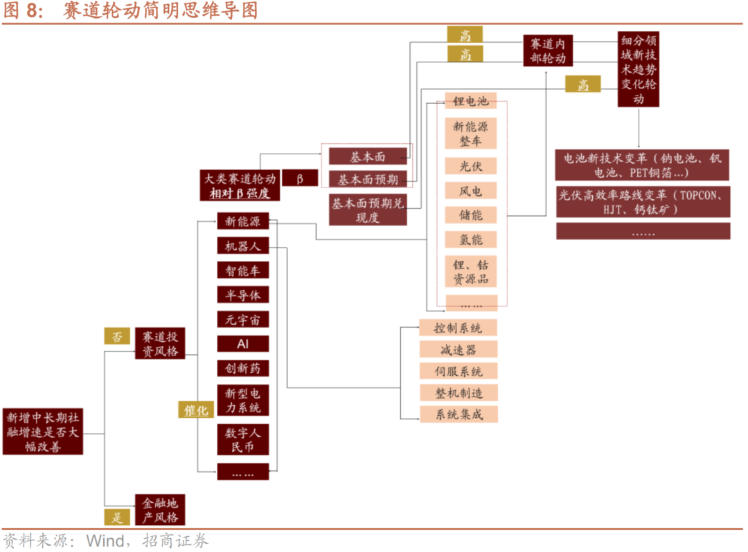 根据我们前述理论,当前布局赛道轮动的前提是大类风格尚未明显切换,大类风格是否切换取决于中长期新增社融增速是否大幅改善,而由于当前部分因素出现,投资者很难像过去每一轮那样,提前布局大类风格轮动,在明确信号出现前,高胜率的决策可能依然是布局赛道投资方向。而赛道轮动层面,大类赛道轮动取决于相对β强度,单个赛道内部细分领域的轮动取决于基本面、基本面预期以及基本面预期兑现度。