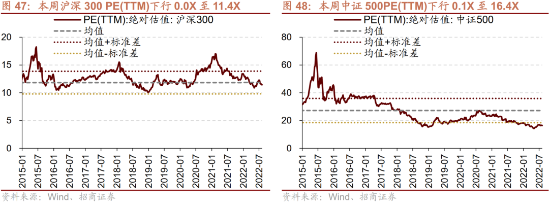 本周全部A股估值水平下行。截至8月5日收盘,全部A股PE(TTM)下行0.1X至14.4X,处于历史估值水平的33.4%分位数。创业板本周上行,PE(TTM)上行0.2X至41.8X,处于历史估值水平的25.6%分位数。代表大盘股的沪深300指数PE(TTM)本周下行0.0X至11.4X,处于历史估值水平的36.5%分位数。代表中小盘股的中证500指数PE(TTM)本周下行0.1X至16.4X,处于历史估值水平的4.8%分位数。