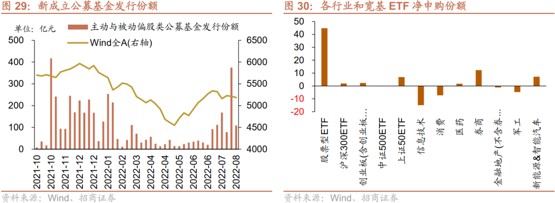 从ETF净申购来看,ETF净申购,宽指ETF以净申购为主,其中上证50ETF申购较多;行业ETF申赎参半,其中券商ETF申购较多,信息技术ETF赎回较多。具体来看,股票型ETF总体净申购44.8亿份。其中,沪深300、创业板ETF、中证500ETF、上证50ETF和双创50ETF分别净申购2.0亿份、净申购2.4亿份、净申购0.0亿份、净申购6.9亿份、净赎回1.8亿份。行业方面,信息技术ETF净赎回14.9亿份;消费ETF净赎回7.3亿份;医药ETF净申购1.7亿份;券商ETF净申购12.3亿份;金融地产ETF净赎回1.2亿份;军工ETF净赎回4.7亿份;原材料ETF净赎回0.1亿份;新能源&智能汽车ETF净申购7.2亿份。