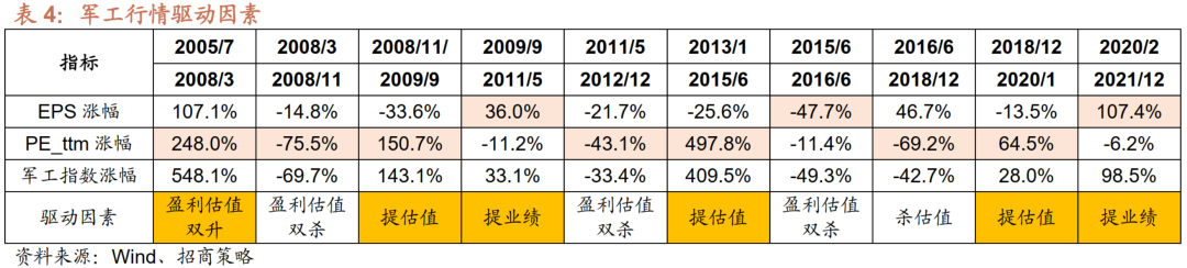 从军工指数的盈利与估值拆分来看,估值对历次军工行情的影响较大。我们将2005-2021年的军工行情按照估值与EPS走势划分为10个区间,其中有7个时间阶段的估值波动大于EPS,体现为上涨期间估值提升更多,下跌期间估值跌幅更大。且盈利与估值的变动并不完全同向,存在多次纯粹的提估值或者提业绩的行情。
