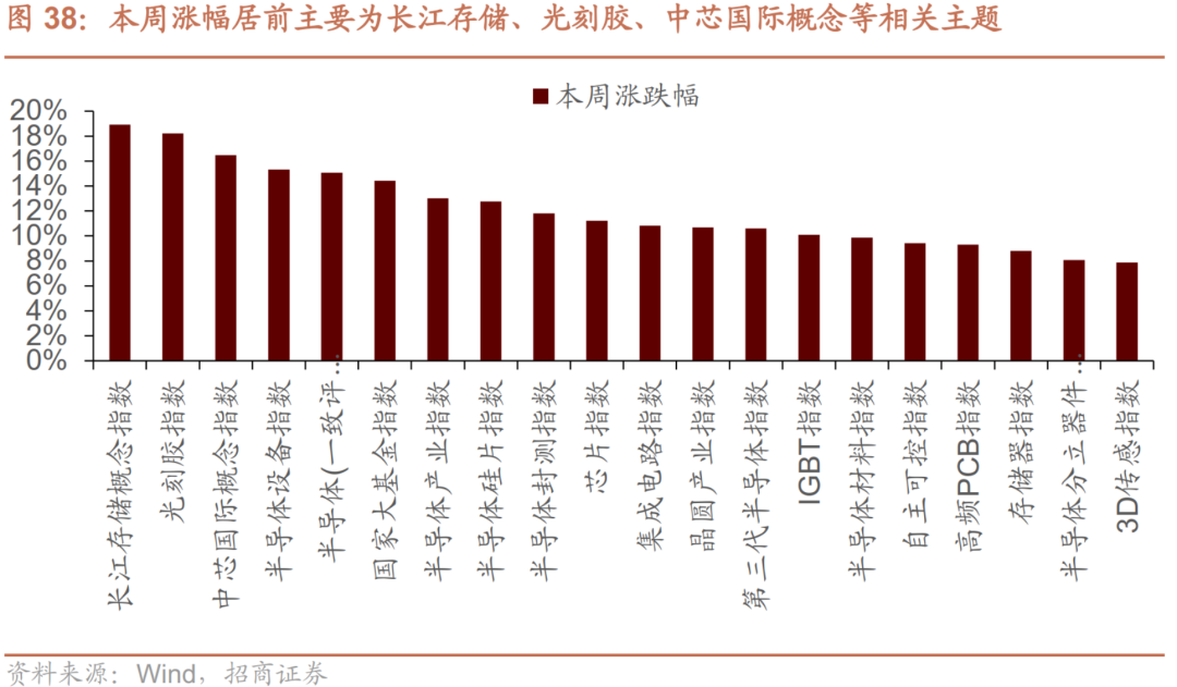 本周市场涨跌互现,Wind全A指数周度下跌0.54%,创业板指上涨0.49%,沪深300下跌0.32%。本周涨幅居前的主要为长江存储、光刻胶、中芯国际概念等相关主题。