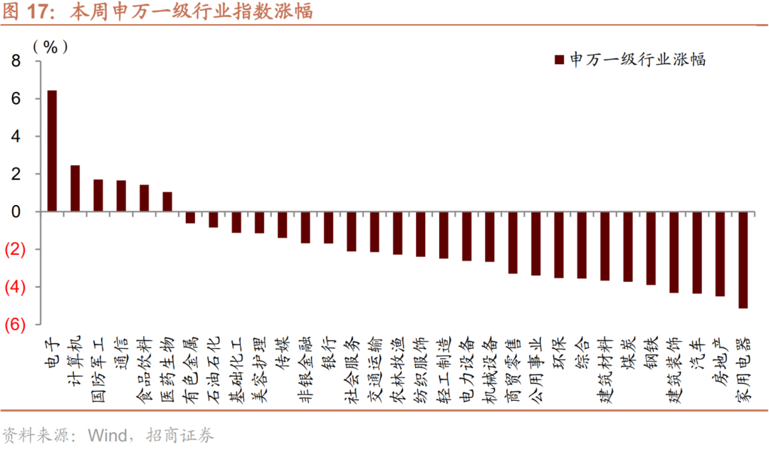 从行业上来看,本周申万一级行业多数下跌,仅6个一级行业上涨,电子、计算机、国防军工涨幅居前,家电、房地产、汽车板块跌幅居前。从涨跌原因来看,本周涨幅居前的行业原因主要为,电子(主要为半导体板块带动,近期美国众议院通过了《芯片和科技法案》,将为在美国本土新建芯片工厂补贴数百亿美元的补贴作为激励措施,而且将限制14纳米以下芯片技术输出,进一步凸显了我国半导体供应链“自主可控”的重要性)、计算机(同样是自主可控逻辑)、国防军工(地缘政治事件的催化),跌幅居前的行业主要为顺经济周期板块,如家电、房地产(主要原因在投资者担忧复苏期拉长)、汽车(前期涨幅较大,赛道轮动调整)。