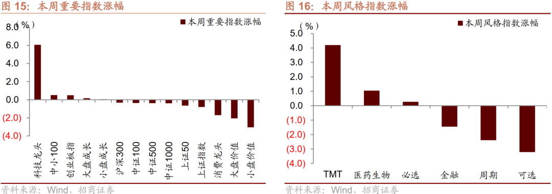本周A股主要指数多数下跌,科技龙头、中小100、创业板指涨幅居前,小盘价值、大盘价值、消费龙头指数跌幅居前,本周日均成交10370.1亿元,较上周相比有所放量。南向资金本周净流入港股77.3亿港币,北向资金本周净流出A股12.3亿人民币。
