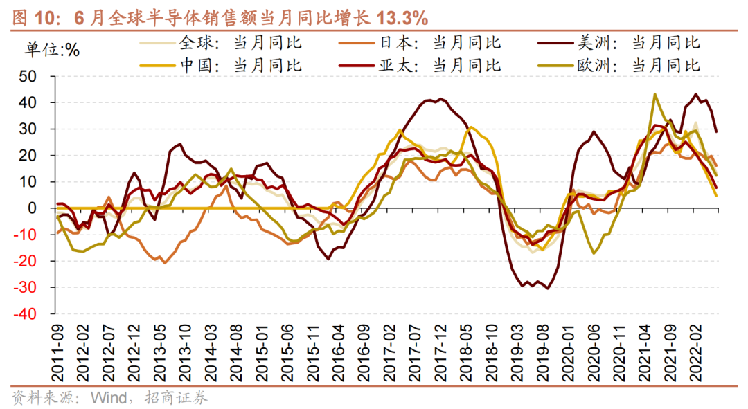 6月全球半导体销售额同比增幅缩窄,美洲、欧洲、日本、中国和亚太地区销量同比增幅均有所缩窄。根据美国半导体产业协会统计数据,6月全球半导体当月销售额为508.2亿美元,同比上行13.3%,较上月份涨幅缩窄4.7个百分点。从细分地区来看,美洲半导体销售额为120.9亿美元,同比增长29.0%,较上月涨幅缩窄7.9个百分点;欧洲地区半导体销售额为43.9亿美元,同比增长12.4%,涨幅较上月缩窄3.7个百分点;日本半导体销售额为41.0亿美元,同比增长16.1%,涨幅较上月缩窄3.7个百分点;中国地区半导体销售额为165.4亿美元,同比增长4.7%,涨幅较上月缩窄4.4个百分点;亚太地区半导体销售额为302.4亿美元,同比增长7.8%,涨幅较上月缩窄4.2个百分点。