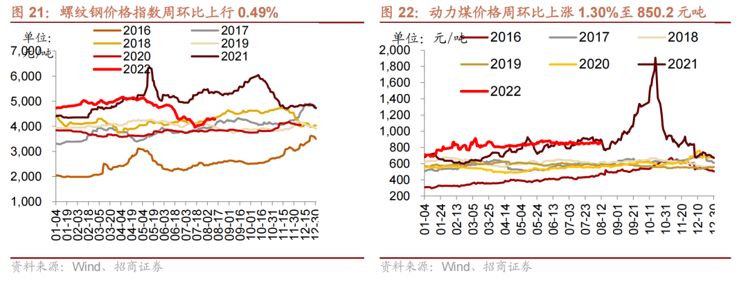 焦煤、焦炭期货价格上涨,动力煤期货价格上涨。截至8月12日,焦炭期货价格周环比上行1.89%至2944.5元/吨,焦煤期货价格周环比上涨1.31%至2169.0元/吨,动力煤期货价格周环比下降1.30%至850.2元/吨。