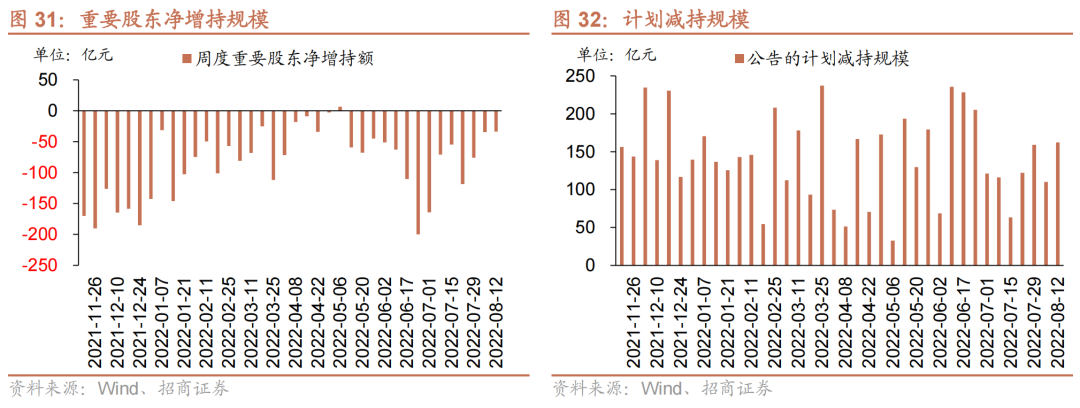 从资金需求来看,重要股东净减持规模缩小,计划减持规模提升。本周重要股东二级市场增持10.7亿元,减持44.6亿元,净减持33.9亿元,净减持规模缩小。其中,净增持规模较高的行业包括综合、建筑装饰、轻工制造等;净减持规模较高的行业包括化工、医药生物、电气设备等。本周公告的计划减持规模为162.2亿元,较前期提升。