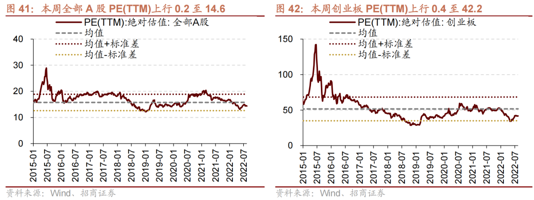 本周全部A股估值水平上行。截至8月12日收盘,全部A股PE(TTM)上行0.2至14.6,处于历史估值水平的37.5%分位数。创业板估值本周上行,PE(TTM)上行0.4至42.2,处于历史估值水平的27.3%分位数。代表大盘股的沪深300指数PE(TTM)本周上行0.1至11.5,处于历史估值水平的38.1%分位数。代表中小盘股的中证500指数PE(TTM)本周上行0.3至16.7,处于历史估值水平的6.6%分位数。