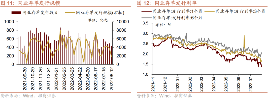同业存单发行规模下降,发行利率涨跌不一。8月8日-8月12日,同业存单发行431只,较上期减少62只;发行总规模1799.7亿元,较上期减少1850.0亿元;截至8月12日,1个月、3个月和6个月发行利率分别较前期变化-20.9bp、-15.2bp、18.4bp至1.39%、1.67%、2.06%。