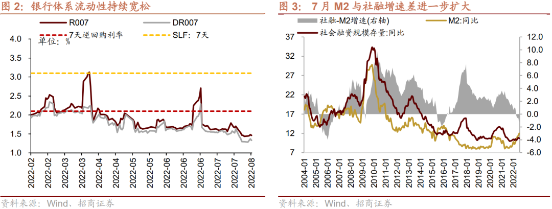 第一,MLF缩量续作显示央行有意对过度宽松的资金面进行纠偏,引导市场利率向政策利率回归。今年受疫情和经济下行的影响,实体融资需求不足,流动性淤积在银行体系,导致资金面一直偏宽松,4月下旬以来DR007和R007均持续低于7天逆回购利率。7月金融数据中,高M2与低社融的背离状态也进一步说明了这一现象。在此情况下,MLF缩量续作,进行资金回笼,表明央行有意引导资金面收敛,向政策利率回归,防止资金空转套利。