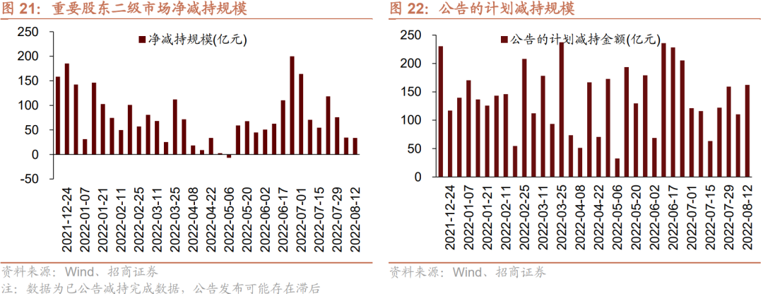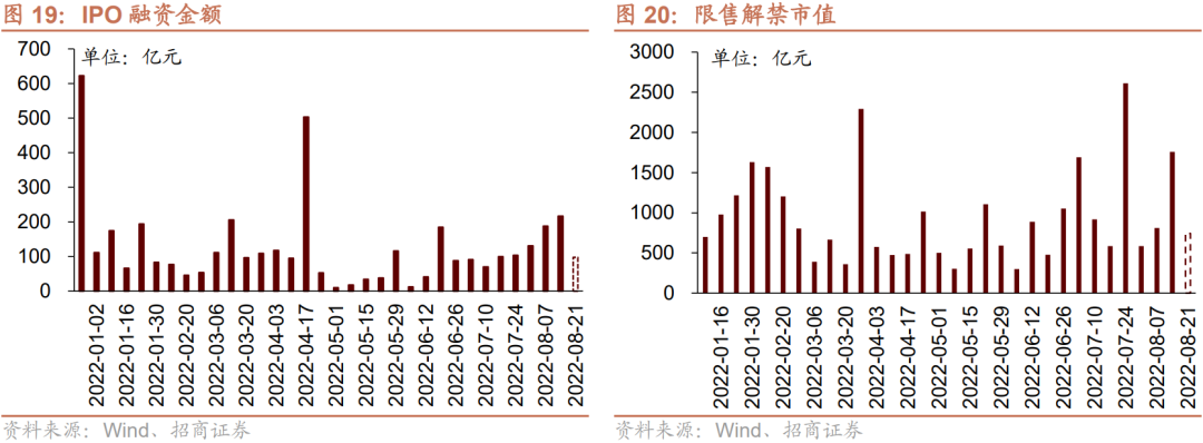 资金需求方面,8月8日-8月12日,IPO融资金额回升至216.5亿元,共有10家公司进行IPO发行,截至8月15日公告,未来一周将有10家公司进行IPO发行,计划募资规模97.8亿元。重要股东净减持规模缩小,净减持33.9亿元;公告的计划减持规模162.2亿元,较前期上升。