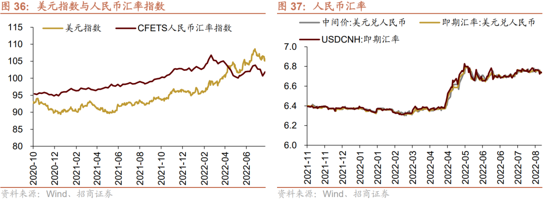 8月8日-8月12日,美元指数回落,人民币相对美元升值。截止8月12日,美元指数收于105.68,较前期(8月7日)下降0.89点,人民币汇率指数较前期上升1.2点收于101.9点,美元兑人民币中间价上升、即期汇率下降、离岸汇率下降,分别为6.74、6.73、6.74,人民币升值。